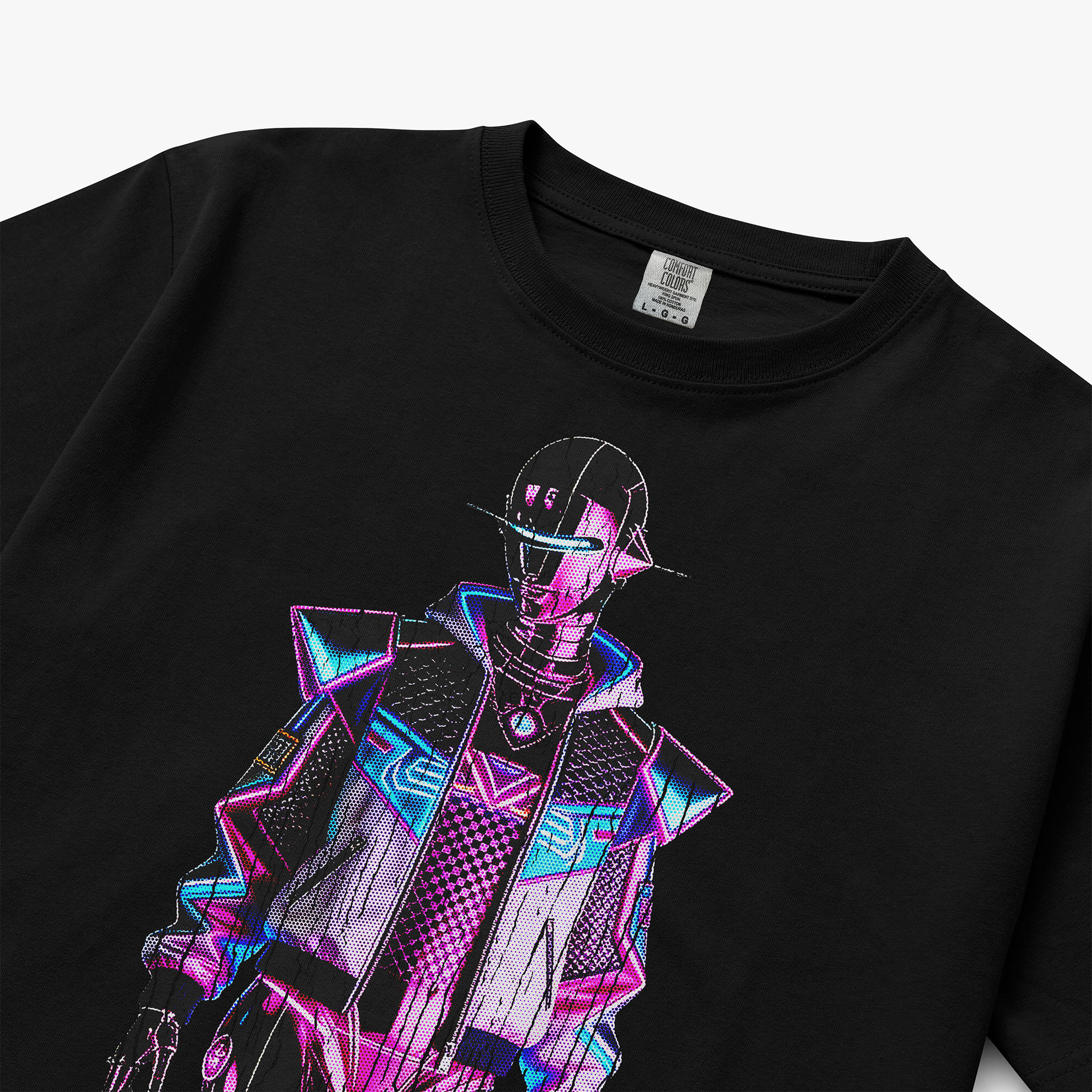 This cyberpunk-inspired graphic t-shirt features a futuristic neon-clad figure styled in bold magenta, cyan, and electric blue accents. The sleek, high-contrast design blends streetwear edge with sci-fi energy, creating a sharp, modern statement against the deep black base.