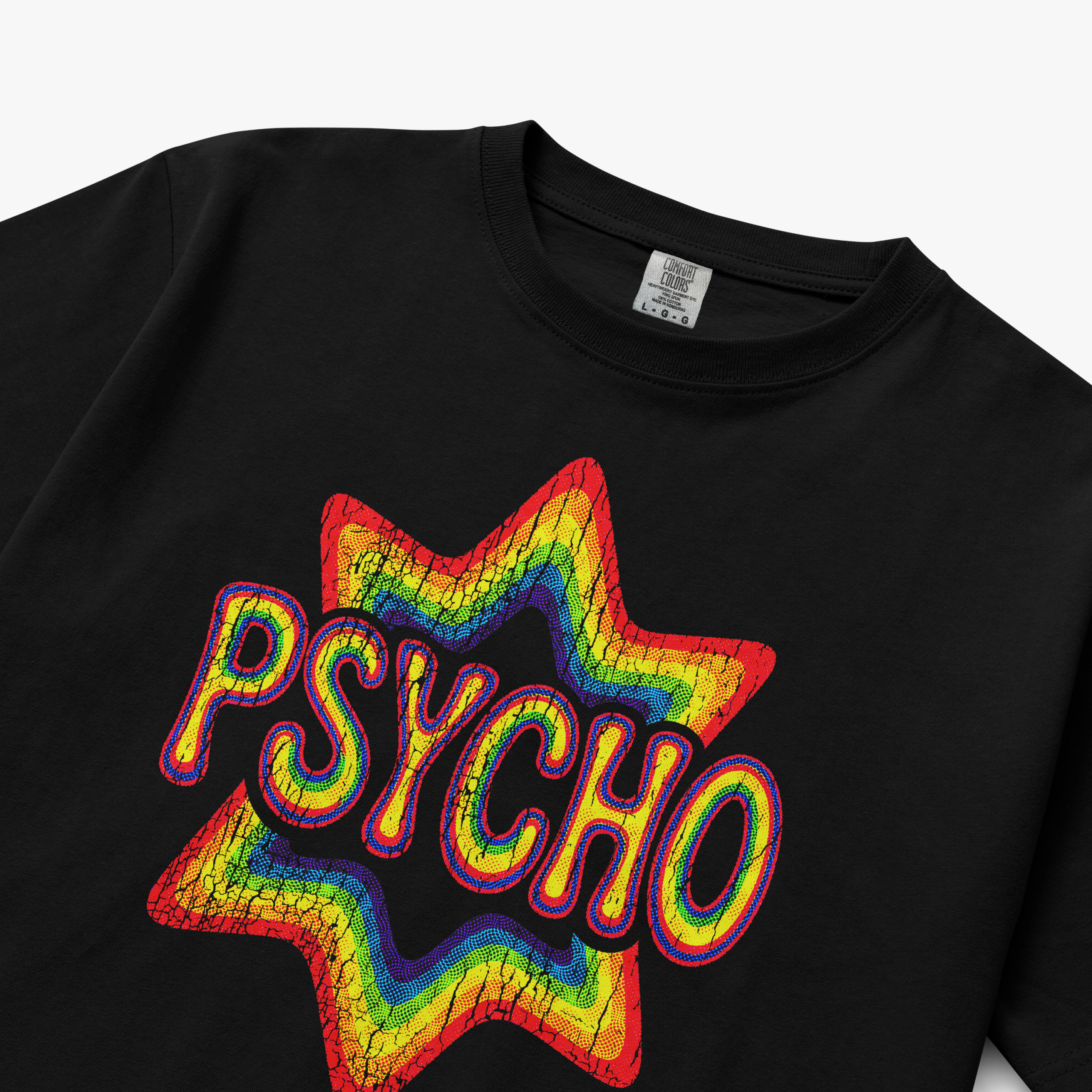 This rainbow star βPsychoβ graphic t-shirt is printed on the premium Comfort Colors C1717 Adult Heavyweight Short Sleeve Tee, known for its durable construction and soft, garment-dyed feel.