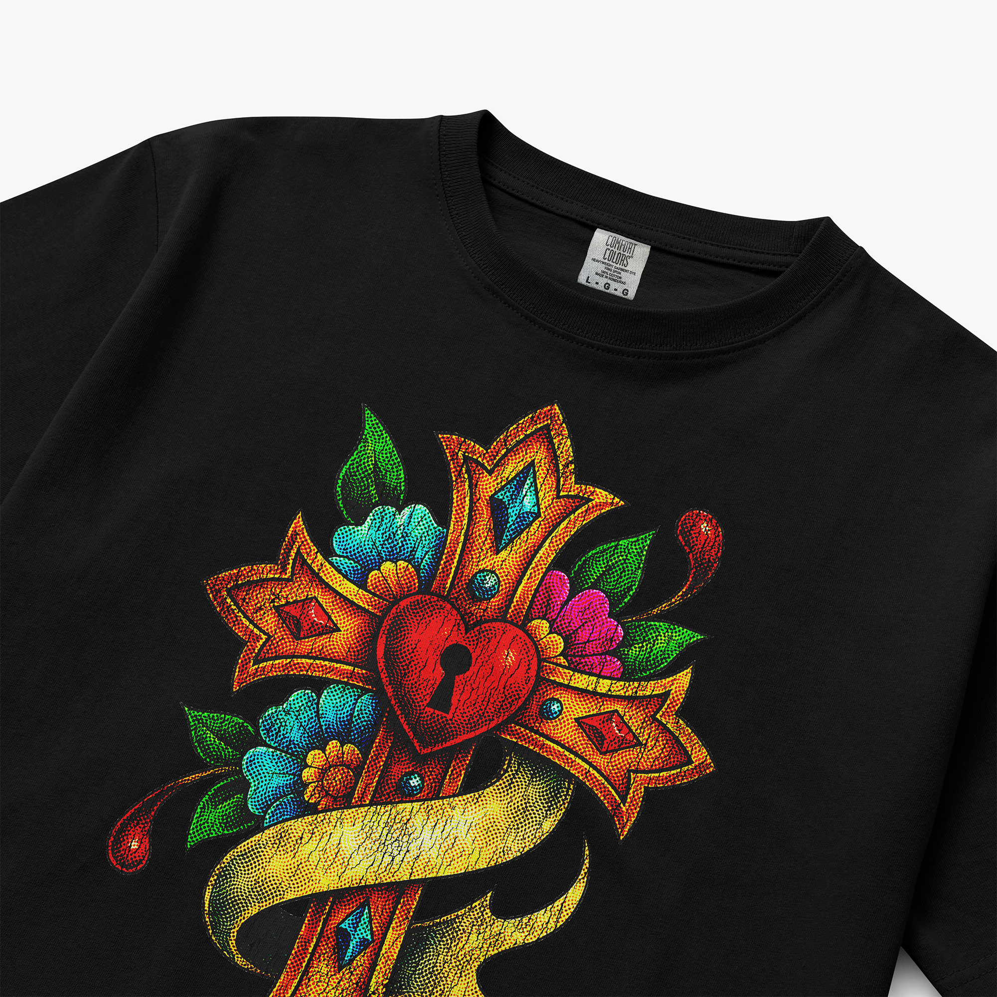 This ornate cross graphic t-shirt features a jeweled sacred heart centerpiece with a keyhole detail, wrapped in golden ribbon and surrounded by vibrant floral accents. The bold reds, golds, blues, and greens create a rich, tattoo-inspired aesthetic that stands out sharply against the deep black base.